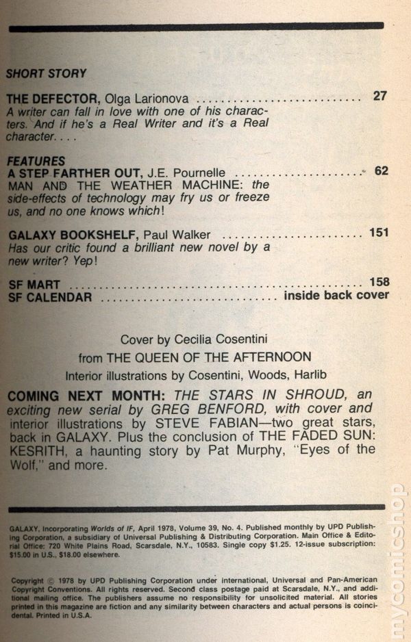 April 1978. Cover by Cecilia Cosentini. Science Fiction Stories by C. J. Cherryh, Don Trotter, Cordwainer Smith, Jor Jennings, Olga Larionova. Interior Illustrations by Cosentini, Joan Hanke-Woods, Harlib. Softcover Pulp Digest, 5-in x 7 1/2-in, 160 Pages, B&W. Cover price $1.25.