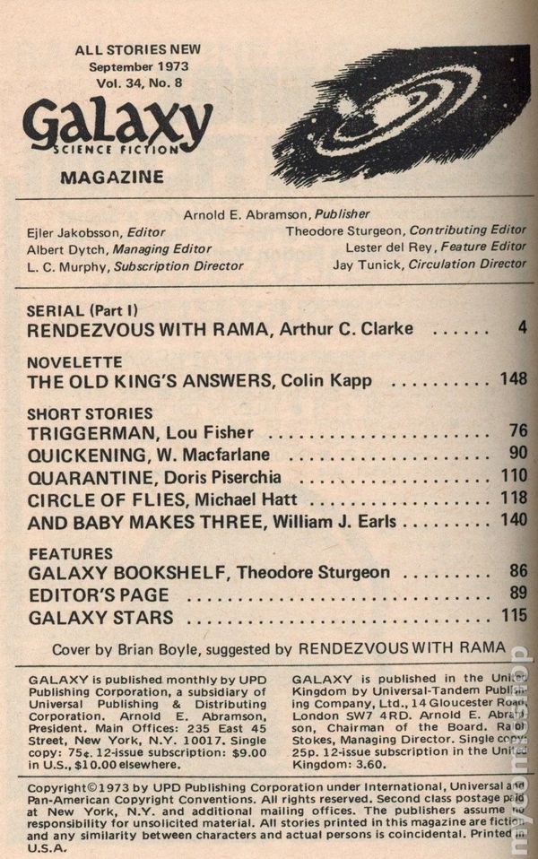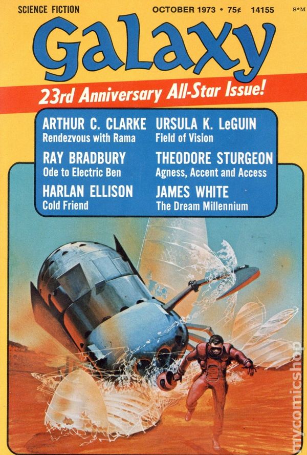 October 1973. Cover by Brian Boyle. Science fiction stories by Arthur C. Clarke, James White, Theodore Sturgeon, Harlan Ellison, Ursula K. Leguin. Ray Bradbury poem. Illustrations by Gaughan. 5-1/4-in. x 7-1/4-in.; b&w text with spot illustrations; 192 newsprint pages. Cover price $0.75.