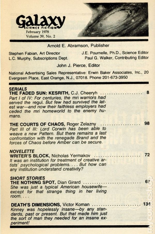 Cover by Amy Harlib. Science Fiction Stories by C. J. Cherryh, Roger Zelazny, Nicholas Yermakov, Dian Girard, Victor Koman. Interior Illustrations by Amy Harlib, Jim Mueller, Anji Valenza. Softcover Pulp Digest, 5-in x 7 1/2-in, 160 Pages, B&W. Cover price $1.25.