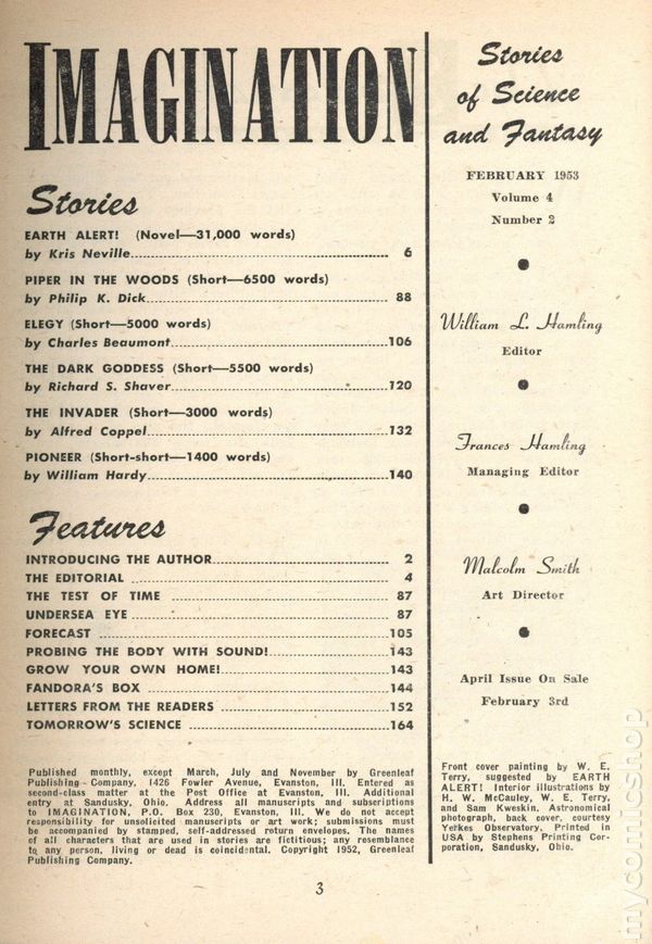April 1953. Cover by W. E. Terry. Science fiction stories by Geoff St. Reynard, Richard S. Shaver, Rog Phillips, Daniel F. Galouye, Dave Dryfoos, and Louis G. Daniels. Illustrations by W. E. Terry and H. W. McCauley. 5-3/8 in. x 7-5/8 in; black and white; 162 pages. Cover price $0.35.
