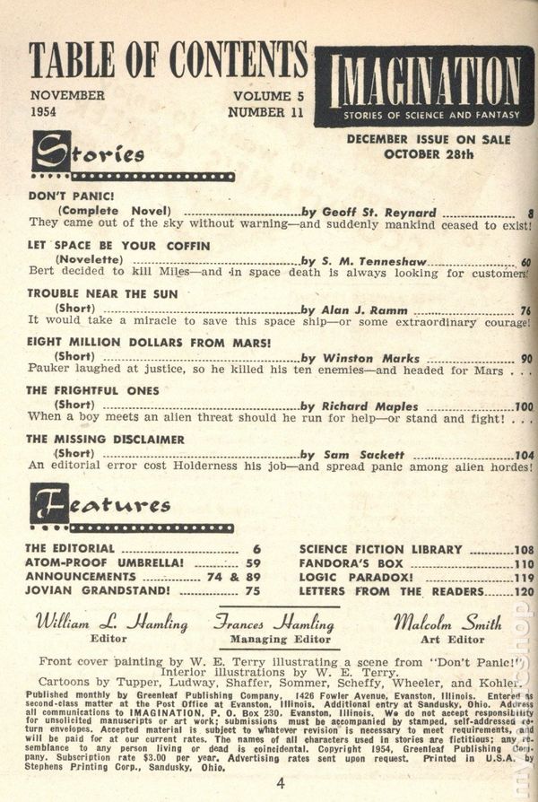October, 1955 Volume 6, Issue 8. NOTE: Vol. 6 #8-Up subtitled Science Fiction. 5-3/8 in. x 7-5/8 in; black and white; 162 pages. Cover price $0.35.