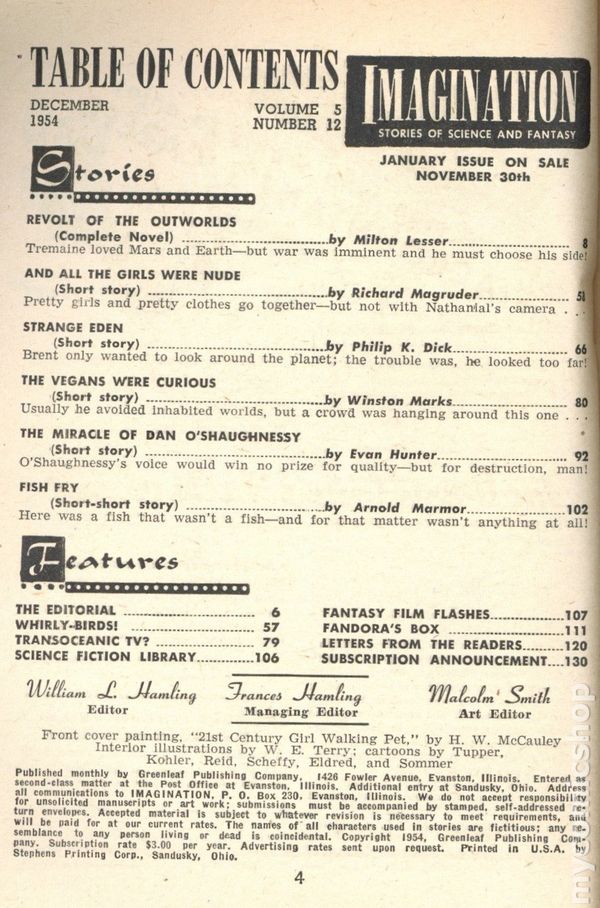 December 1954. Science fiction stories: "Revolt of the Outworlds" by Milton Lesser, "And All the Girls Were Nude" by Richard Magruder, "Strange Eden" by Philip K. Dick, "The Vegans Were Curious" by Winston Marks, "The Miracle of Dan O'Shaughnessy" by Evan Hunter, and "Fish Fry" by Arnold Marmor. Illustrations by W.E. Terry. Cover by H.W. McCauley. 5-3/8 in. x 7-1/4 in; black and white; 128 pages. Cover price $0.35.