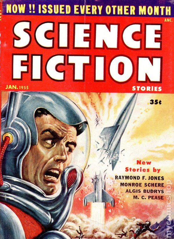 January 1955. Science fiction stories: "The Gift of the Gods" by Raymond F. Jones, "Ripeness" by M.C. Pease, "INherit the Earth" by Monroe Schere, "The Two Sharp Edges" by Algis Budrys, "The Next Time" by Garda Jamieson, and "It Should Happen to a Dog" by Dennis Wiegand. Illustrations by Kelly Freas, Ed Emsh, and Paul Orban. Cover by Emsh. 5-1/2 in. x 7-1/8 in.; black and white; 128 newsprint pages. Cover price $0.35.