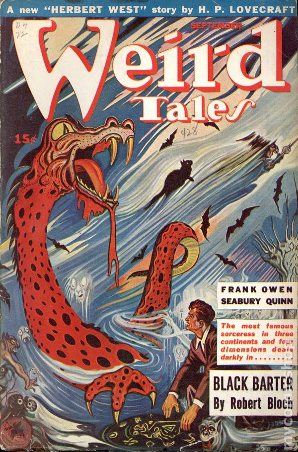 November 1943. Cover by A. R. Tilburne. "The Ducker" by Ray Bradbury, "A Thin Gentleman with Gloves" by August Derleth, and "Herbert West: Reanimator" by H. P. Lovecraft, plus other horror and supernatural tales by Edmond Hamilton, Allison V. Harding, Helen W. Kasson, Manly Wade Wellman, Greye La Spina, and James Causey & Bill Blackbeard. Illustrations by Hannes Bok, A. R. Tilburne, Boris Dolgov, John Giunta, Matt Fox, Fred Humiston, Irwin J. Weill. 6 3/4-in. x 10-in., 116 newsprint pages, black and white (text with illustrations). Cover price $0.15.