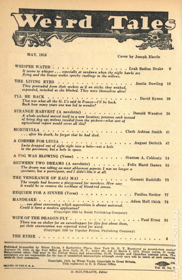 May 1953. Cover by Joseph Eberle. Horror and supernatural fiction by Leah Bodine Drake "Whisper Water", Justin Dowling, David Eynon, Donald Wandrei, Clark Ashton Smith, August Derleth "A Corner for Lucia", Felix Marti Ibanez, Garnett Radcliffe, Adam Hull Shirk, and Paul Ernst. Illustrations by Joseph Eberle, W. H. Silvey, Virgil Finlay, Jon Arfstrom, Charles A. Kennedy, and Anthony Di Giannurio. 6 3/4" x 10"; black and white; 96 newsprint pages. Cover price $0.25.