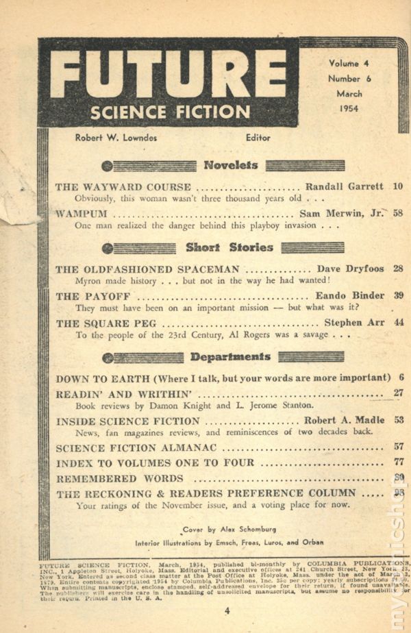 Volume 4, Issue 6 - March 1954. Science Fiction and adventures stories featuring "The Wayward Course" by Randall Garrett, "The Wampum" by Sam Merwin Jr., and "The Square Peg" by Stephen Arr. 7-in. x 10-in. 96 newsprint pages B&W. Cover price $0.25.