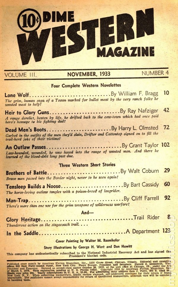 Volume 3, Issue 3 - October 1933. Cover by Walter M. Baumhofer. Western adventure stories by E. B. Mann, Grant Taylor, Dabney Otis Collins, Walt Coburn, Harry F. Olmsted, Ray Nafzinger, and Bart Cassidy. 7-in. x 9 1/2-in., 128 pages, Text (with B&W illustrations) Cover price $0.10.