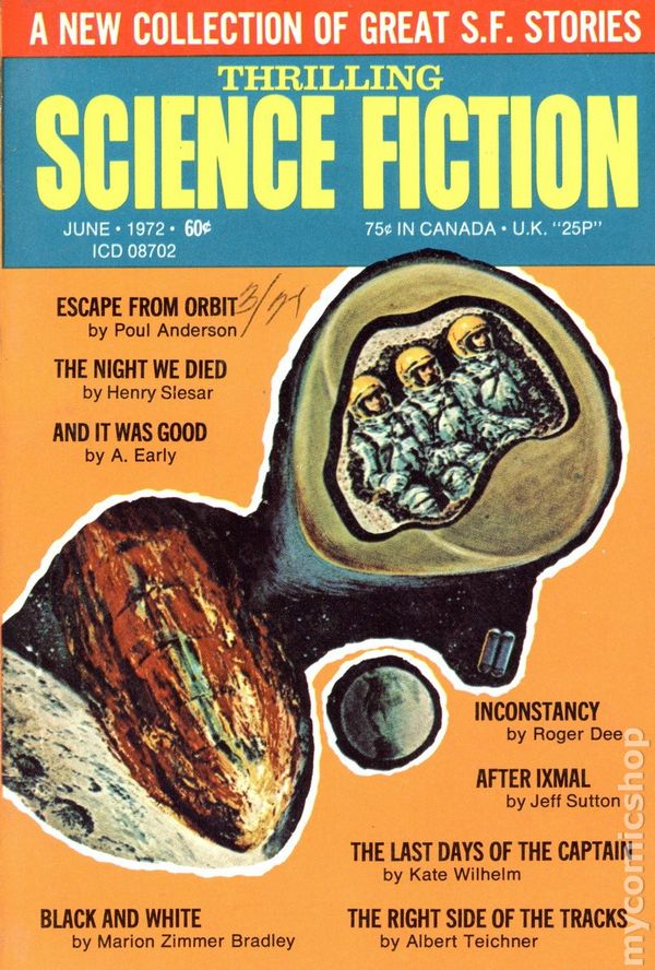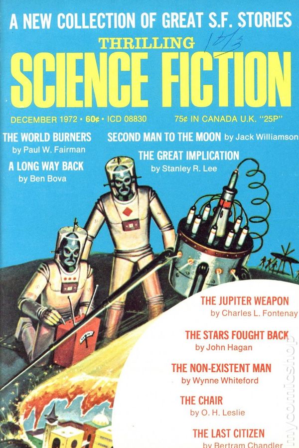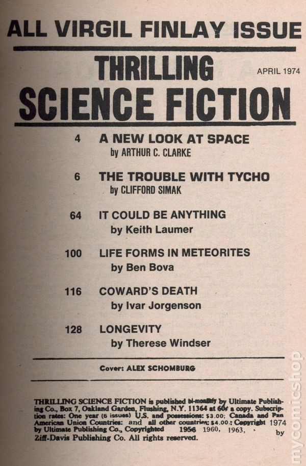 Not numbered. October 1974. Cover by Robert Adragna. Science fiction reprints from Keith Laumer, Robert F. Young, Jack Sharkey, Ben Bova, Frank Tinsley, Robert Silverberg, and Harold Cain. Illustrations by Robert Adragna, George Schelling, Virgil Finlay. 5 1/4-in. x 7 1/2-in.; black and white; 130 pages. Cover price $0.75.