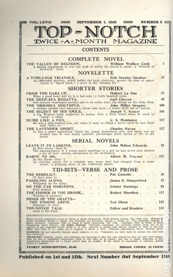 Top-Notch (1910-1937 Street & Smith) Pulp Vol. 67 #4Tags: Pulp AdventurePublished Sep 1926 by Street & Smith.