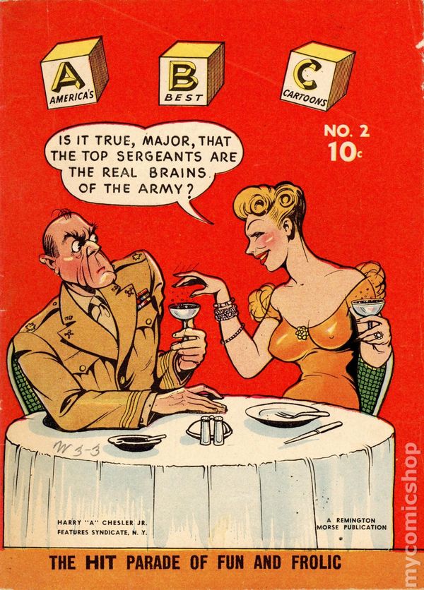 A collection of humor strips and anecdotes. Strips drawn by Harry "A." Chesler Jr. which are mainly military themed jokes and gags. Anecdotes by various writers. Published by Wm. H Wise and Company. Printed date is a guess. Cover price .10. 5" x 7-3/4". Colored. 68 pages. Cover price $0.10.