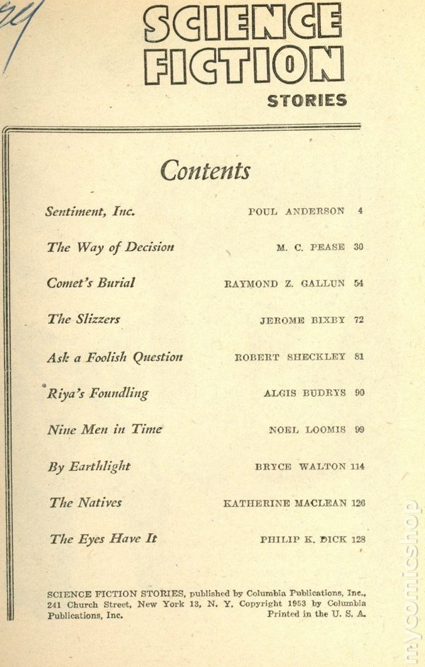 1953 (no month). "The Eyes Have It" by Philip K. Dick. black and white; 128 newsprint pages. Cover price $0.35.