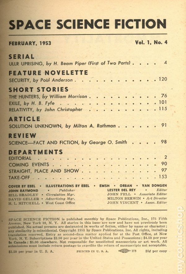 February, 1953. Volume 1, Issue 4. Featuring work from Lester Del Rey and Larry Shaw. Softcover, 5 1/2-in., x 8 1/2-in., 164 pages, Text (with chapter illustrations) Cover price $0.35.