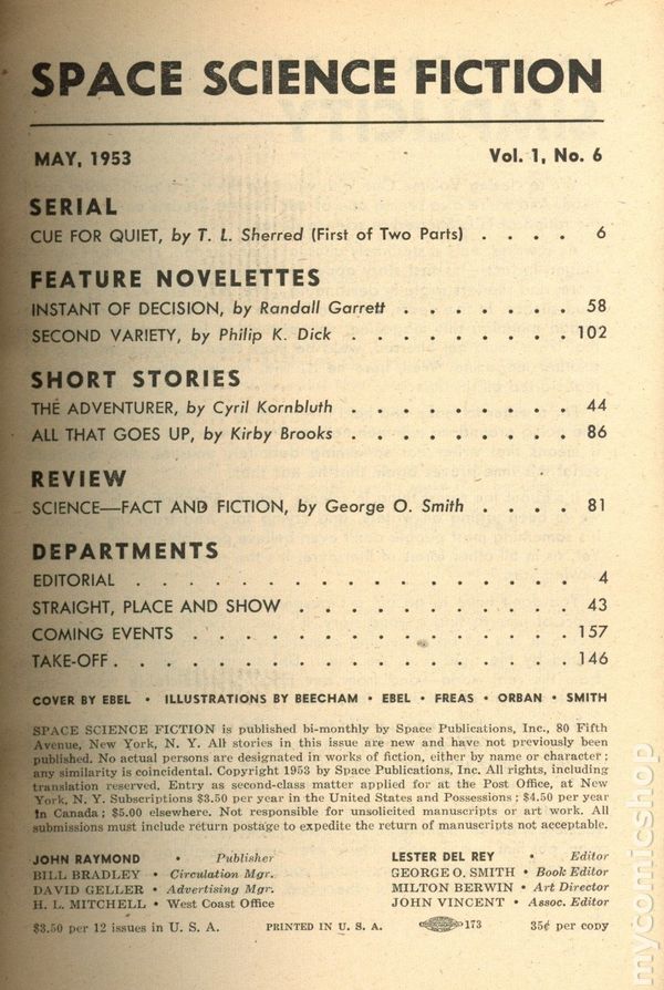 May, 1953. Volume 1, Issue 6. Featuring work from C. M. Kornbluth, and Philip K. Dick. Softcover, 5 1/2-in., x 8 1/2-in., 164 pages, Text (with chapter illustrations) Cover price $0.35.