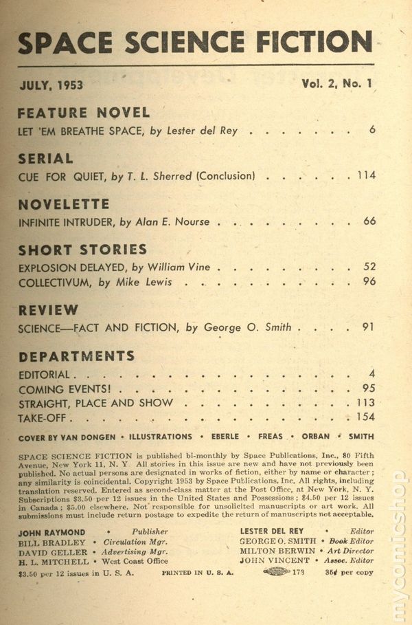 July, 1953. Volume 2, Issue 1. Featuring work from Alan E. Nourse, and Mike Lewis. Softcover, 5 1/2-in., x 8 1/2-in., 164 pages, Text (with chapter illustrations) Cover price $0.35.