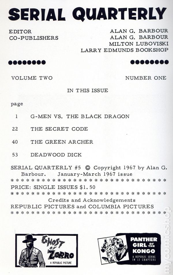 View scansVolume 2, Number 1. In this issue: Episode guide for "G-Men vs. The Black Dragon", "The Secret Code", "The Green Archer" and "Deadwood Dick". Compiled by Alan G. Barbour. 5 1/2-in x 8 1/2-in, 68 Pages, B&W. Cover price $1.50.