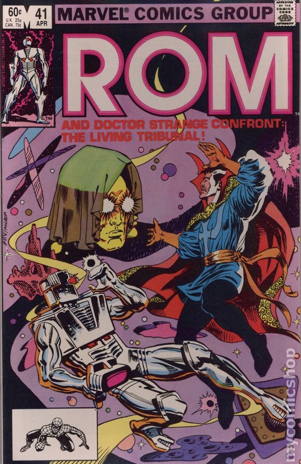 Newsstand Edition. Doctor Strange guest-stars. Story by Bill Mantlo. Art by Sal Buscema and Akin Garvey. While Rom faces the Dweller in the Dark, Dr. Strange Master of the Mystic Arts pleads with the Living-Tribunal on behalf of mankind. Can Rom and Strange bring back the balance between the forces of good and evil? Not if the In-Betweener has anything to say about it. 32 pages Cover price $0.60.