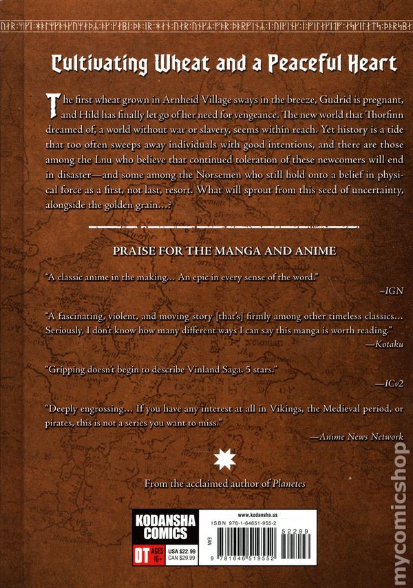 The epic action manga for fans of Game of Thrones. A story of war, royal intrigue, suspense and revenge set against the Viking Age of the 10th-century. After months of hard labor as a farm slave, Thorfinn begins to realize what his father meant by the words, "A true warrior needs no sword." Perhaps he can find a new purchase on life in the mysterious land he heard tell of in his childhood: the continent to the west known as Vinland.