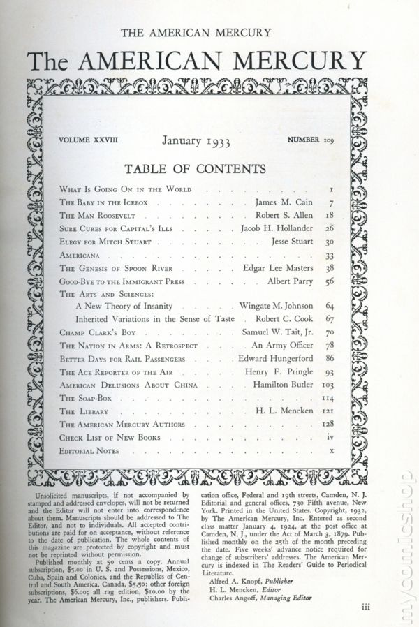 Published Jan 1933 by The American Mercury, Inc..$37.00