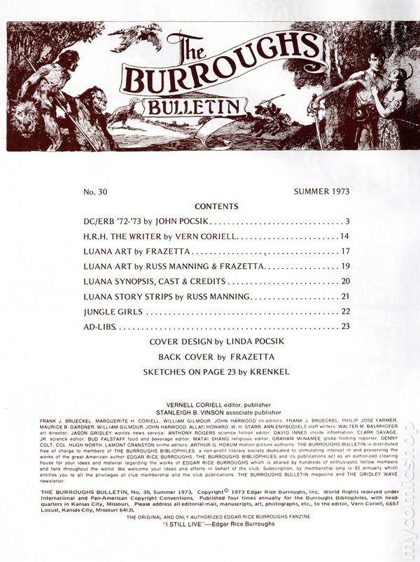 Issue #30 - Summer 1973. Edgar Rice Burroughs fanzine. This issue focuses on DC's Edgar Rice Burroughs comic books. "DC/ERB '72-'73" by John Pocsik, "H. Rider Haggard the Writer" by Vern Coriell, Luana movie promotional artwork by Russ Manning and Frank Frazetta. 8 1/2-in. x 11-in., 28 pages, black and white.
