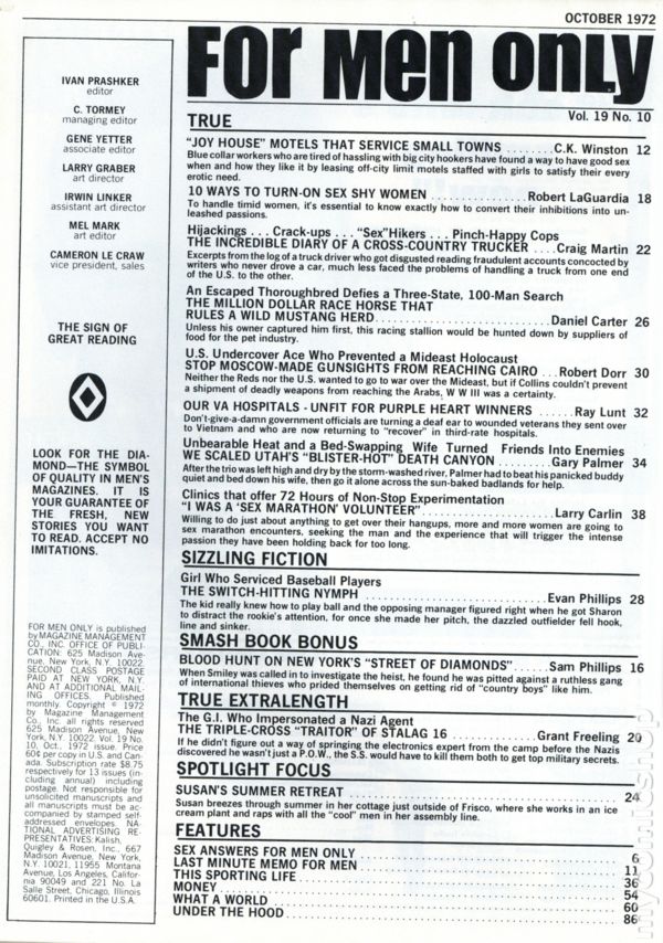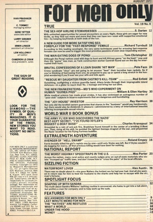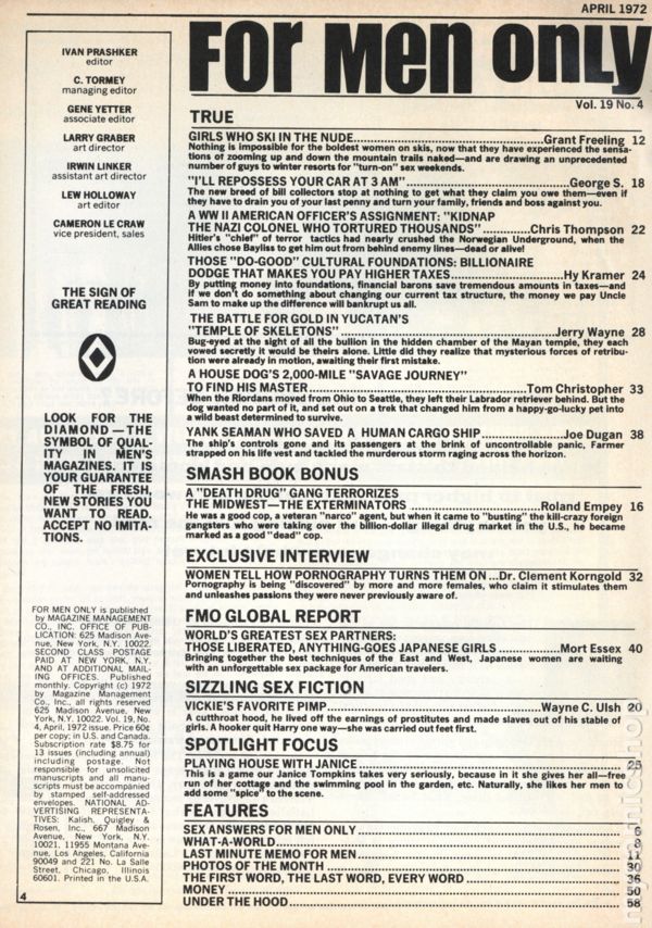 Volume 19, Issue 12 - December 1972. Men's interest magazine featuring stories, articles and pictorials. 8-in. x 11-in. 100 pages. B&W. MATURE. Cover price $0.60.
