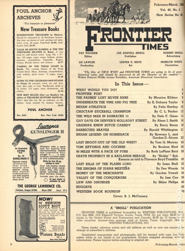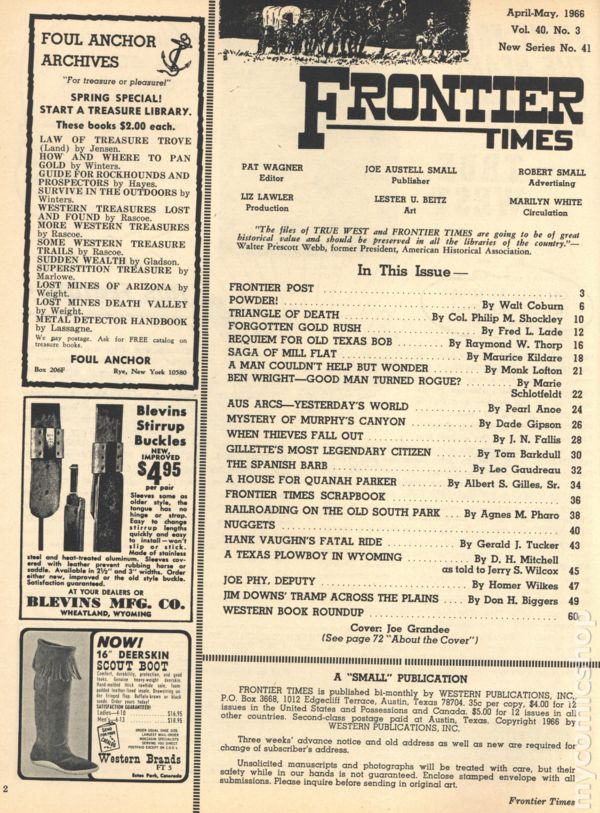 Vol. 40, No. 6 - November, 1966. Magazine of true stories of the American Frontier. Features illustrations and photos of the old west. 8.25" x 11", 72 pages, B&W. Cover price $0.35.