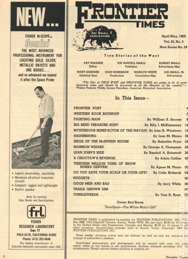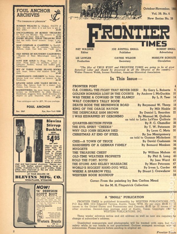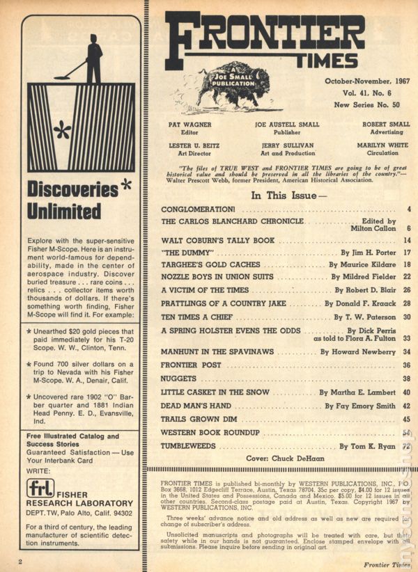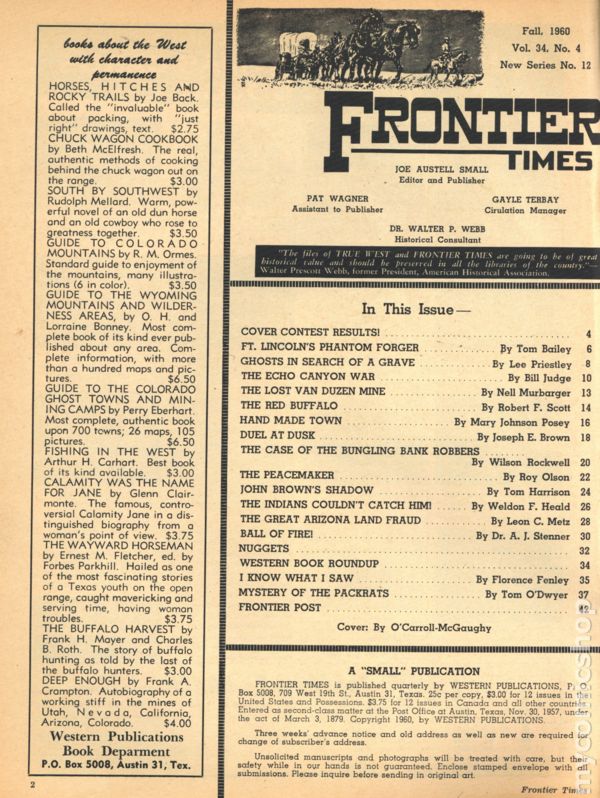 Magazine of true stories of the American Frontier. Cover from Pete Kitchen Museum. Features illustrations and photos of the old west. B&W text. Color cover. 8 1/2-in. x 11-in. 74 pages. Cover price $0.35.