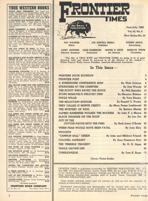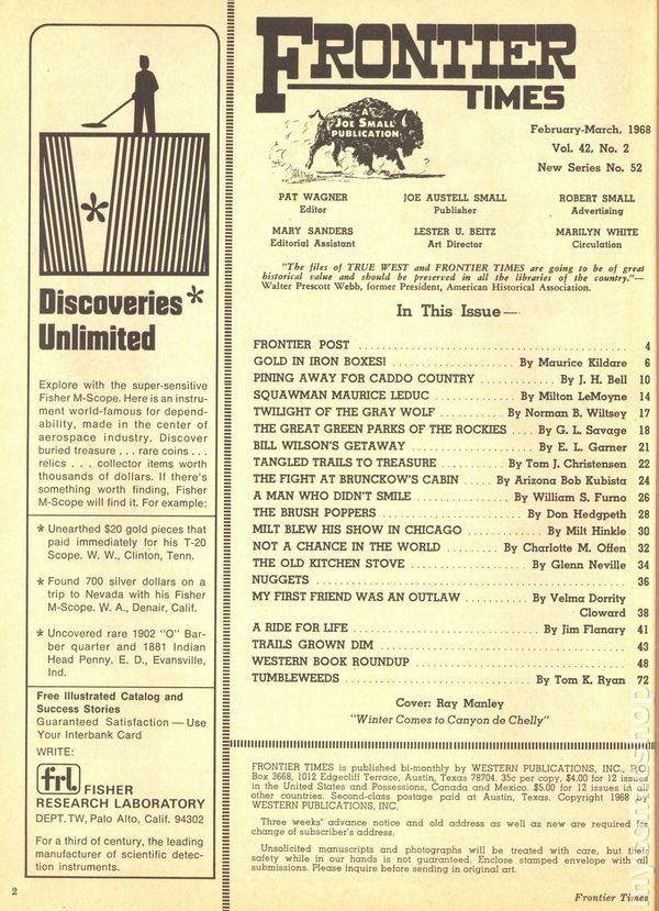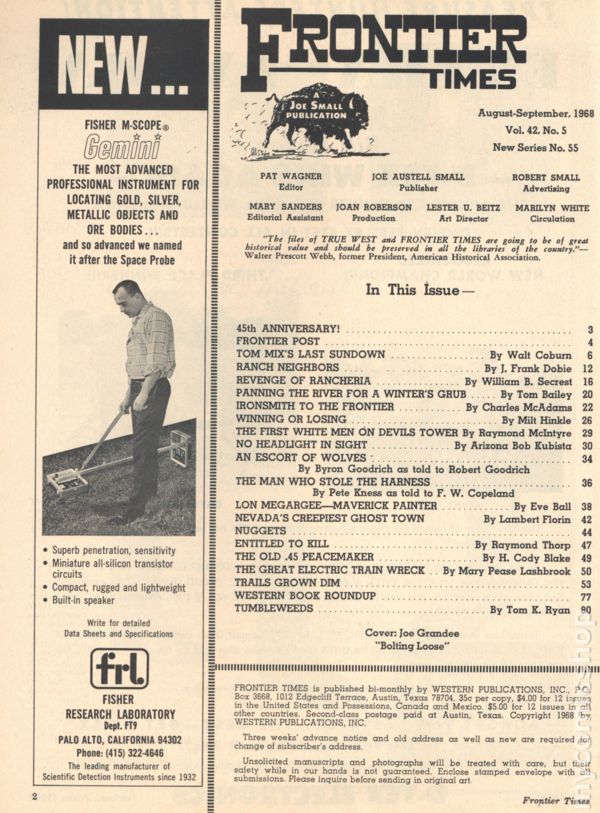 Vol. 42, No. 2 - March, 1968. Magazine of true stories of the American Frontier. Features illustrations and photos of the old west. 8.25" x 11", 72 pages, B&W. Cover price $0.35.