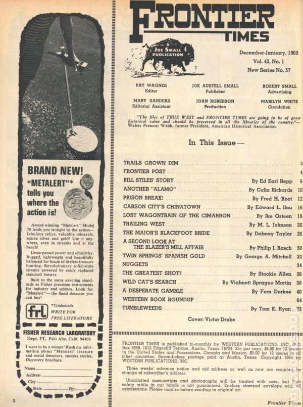 Magazine of true stories of the American Frontier. Features illustrations and photos of the old west. B&W text. Color cover. 8 1/2-in. x 11-in. 72 pages. Cover price $0.35.