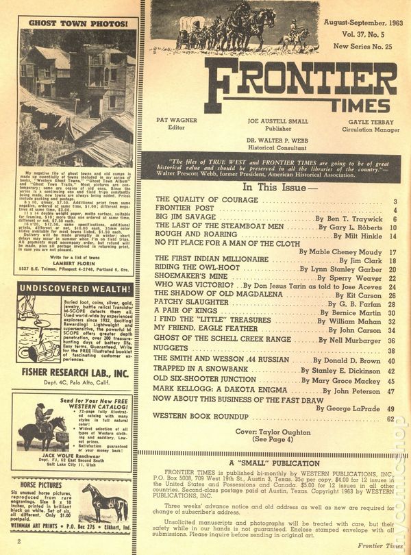 Vol. 37, No. 5 - September, 1963. Magazine of true stories of the American Frontier. Features illustrations and photos of the old west. 8.25" x 11", 66 pages, B&W. Cover price $0.35.