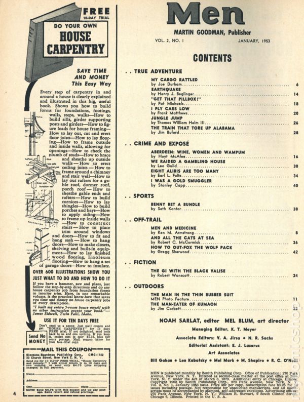 View scansVolume 2, Issue 11 - November 1953. Men's adventure magazine featuring articles on hunting, fitness, politics, true crime, and pin-up pictorials. 8 1/2-in. x 11-in., 84 pages, B&W. Cover price $0.25.