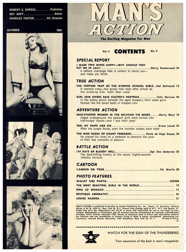 Volume 4, Issue 10 - October 1963. Men's interest magazine including adventure articles and nude photos. 8 1/2-in. x 11-in. 66 pages B&W. Cover price $0.35.