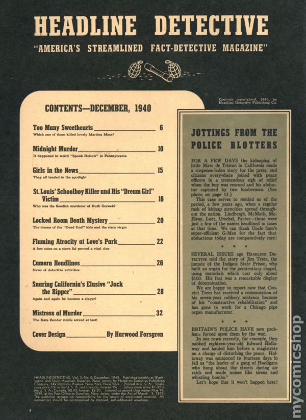 Published Dec 1939 by Headline Detective Publishing Co..This item is not in stock at MyComicShop. If you use the "Add to want list" tab to add this issue to your want list, we will email you when it becomes available.