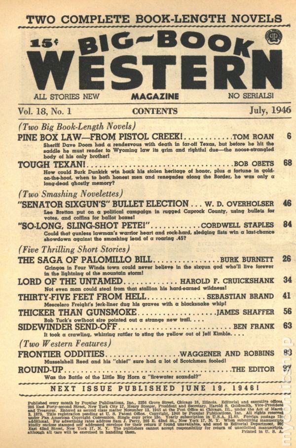 Vol. 18, No. 2. August 1946. Includes: "When Hell Hit Horsethief Crossing" by Walt Coburn; "The Secret of Massacre Mountain" by Giff Cheshire; "Hot Lead, High Iron - and Rawhide Men!" by Ed Earl Repp; "For Sale - One Badge, One Gun, One Man!" by Barry Cord; "The Ranch that God Forgot" by Rod Patterson; and more. 7" x 9.5". 98 pages. Black and white. Text with occasional illustrations. Cover price $0.15.