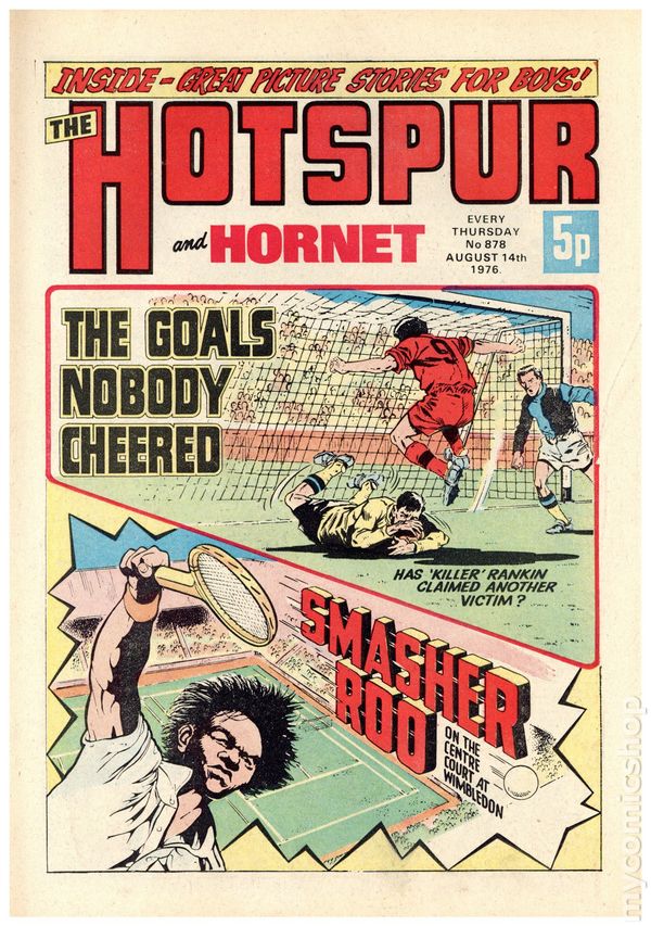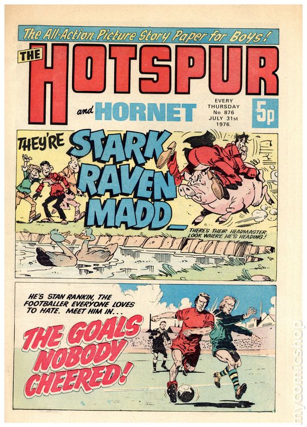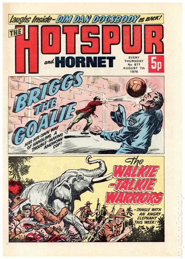 Hotspur and Hornet - July 31st, 1976. Stories include: The Walkie-Talkie Warriors, Cast, Hook and Strike, The Band Rat, They're Star, Raven, Madd!, The Goals Nobody Cheered, Beware the Black Arrows, Smasher Roo, Briggs the Goalie, and Charlie's Ant. 8 1/4" x 12", 32 pages, PC/PB&W, 5p cover price.