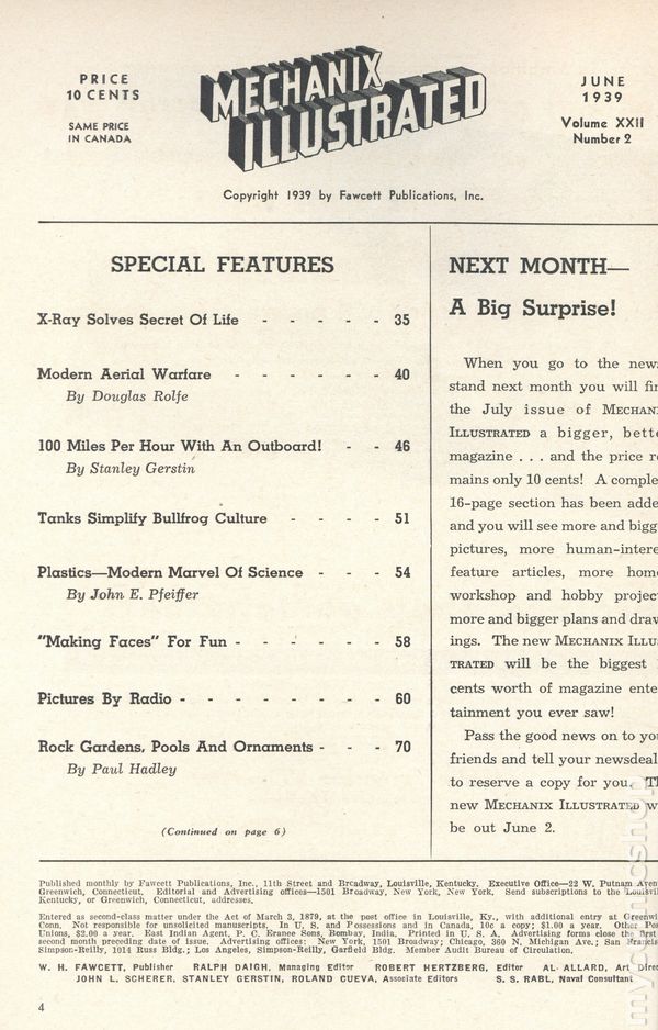 Volume 22, Issue 2 - June, 1939. Mechanical science and technology magazine. This issue's articles include; "100 MPH With an Outboard" by Stanley Gerstin, "Modern Aerial Warfare" by Douglas Rolfe, "Plastics - Modern Day Marvels of Science" by John E. Pfeiffer, "Rock Gardens, Pools and Ornaments" by Paul Hadley. 6 1/2-in. x 9 1/2-in., 114 pages, BW/spot color. Cover price $0.10.