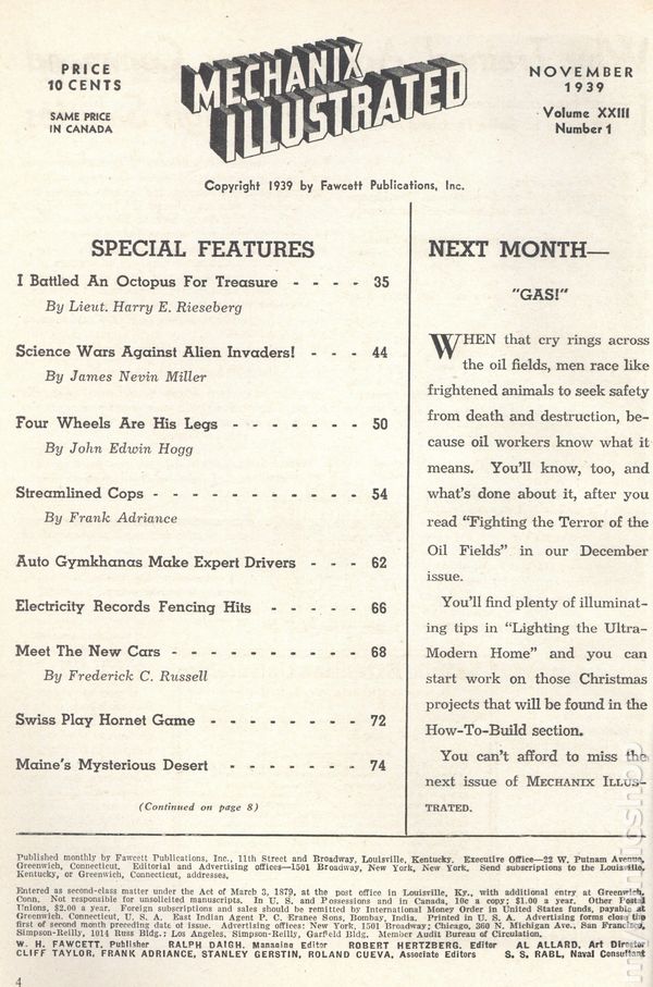 Volume 23, Issue 1 - November, 1939. Mechanical science and technology magazine. This issue includes; "I Battled an Octopus for Treasure" by Harry E. Rieseberg, "Science Wars Against Alien Invaders!" by James Nevin Miller, "Four Wheels Are His Legs" by John Edwin Hogg, "Streamlined Cops" by Frank Adriance, "Meet the New Cars" by Frederick C. Russell, and others. 6 1/2-in. x 9 1/2-in., 146 pages, BW/spot color. Cover price $0.10.