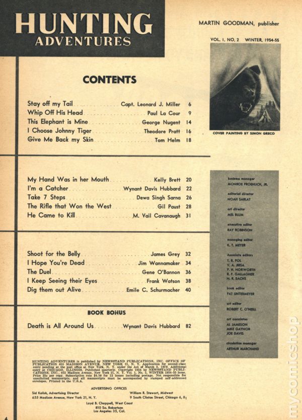 View scansVolume 1, Issue 4 - June 1955. Cover by Simon Greco. Men's magazine focusing on Hunting stories and articles. 8 1/2-in. x 11-in., 98 pages, B&W Cover price $0.35.
