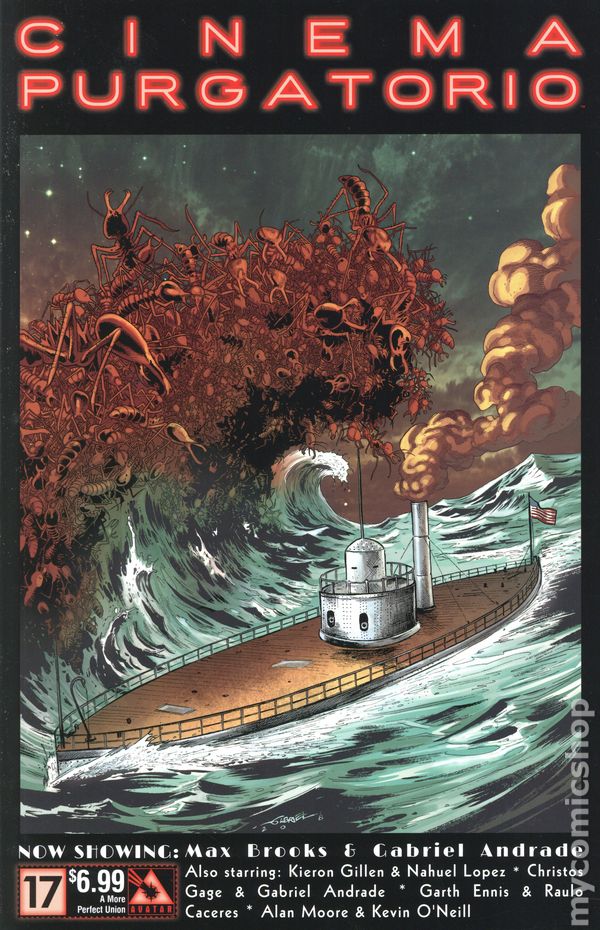 Cover by Kevin ONeill. Writers: Alan Moore, Garth Ennis, Max Brooks, Kieron Gillen, Christos Gage. Artists: Kevin ONeill, Raulo Caceres, Nahuel Lopez, Gabriel Andrade. From the Civil War re-imagined with giant insects, to the dystopian giant monsters of the Vast. Seduced by the cute, yet overwhelmed, Pru or guffawing at the madcap Modded. Or just enthralled by the tapestry of cinematic history upon which Alan Moore is weaving another masterful tale, the finest anthology in history continues. Join a master class of sequential artisans as they spin stories to terrify and delight. Now showing: Cinema Purgatorio by Alan Moore and Kevin O'Neill, A More Perfect Union by Max Brooks and Gabriel Andrade, Code Pru by Garth Ennis and Raulo Caceres, Modded by Kieron Gillen and Nahuel Lopez, and The Vast by Christos Gage and Gabriel Andrade. . 48 pages, B&W. Mature Readers Cover price $6.99.