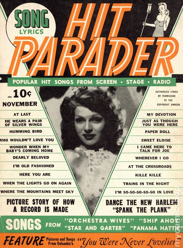 First Issue - November 1942. Rita Hayworth cover. This issue features photos and lyrics from You Were Never Lovelier. Song lyrics, short gossip articles and period photographs. Long running music magazine featuring articles, song lyrics and fan letters. 8 1/2-in. x 11-in., 34 pages, B&W Cover price $0.10.
