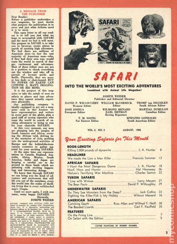 View scansVolume 2, Issue 3 - October, 1955. Cover by Robert Doares. Men's interest magazine focusing on true-life jungle and hunting stories and articles. 8 1/2-in. x 11-in., 82 pages, Text with B&W photos Cover price $0.35.