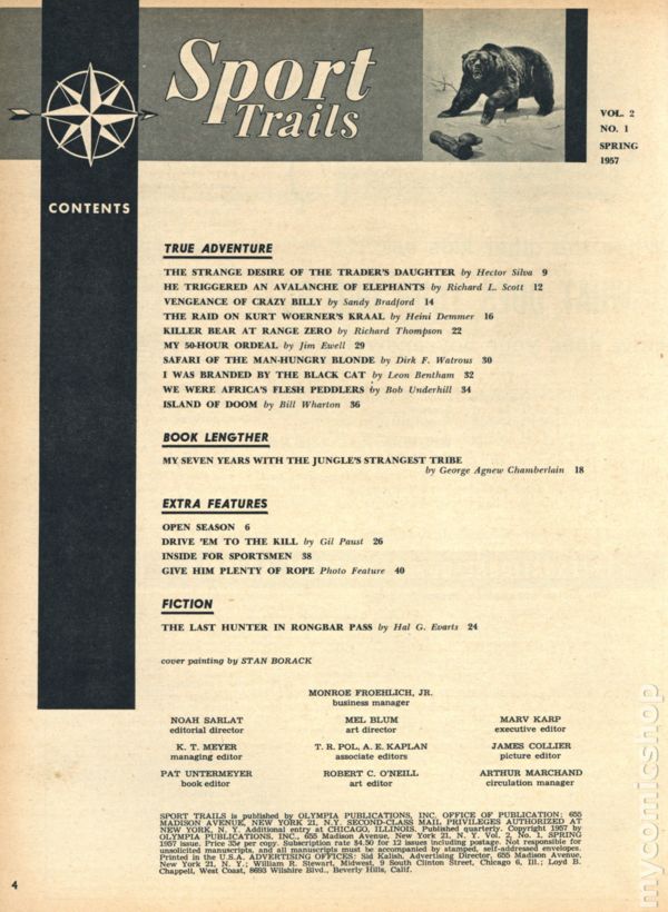 Spring 1957. Published by Martin Goodman. Men's magazine focusing on hunting stories and articles. Cover by Stan Borack. Illustrations by Samson Pollen, John Leone, Gil Comen, Rudy Belarski, Tom Ryan, Morton Engel. 8 1/2-in. x 11-in., 98 pages, B&W Cover price $0.35.