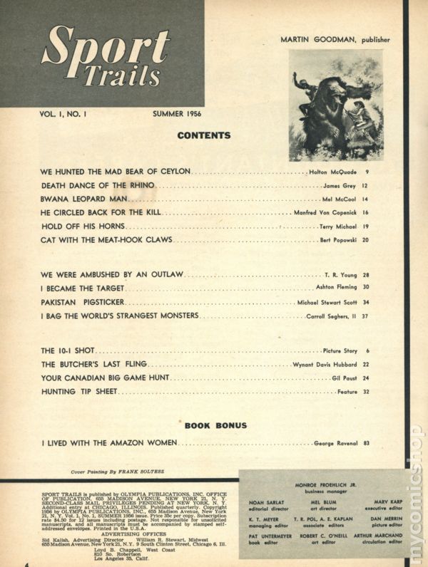 Summer 1956. Published by Martin Goodman. Men's magazine focusing on Hunting stories and articles. Cover by Frank Soltesz. Illustrations by Rudy Belarski, Mort Kunstler, Tom Ryan, Samson Pollen. 8 1/2-in. x 11-in., 98 pages, B&W Cover price $0.35.
