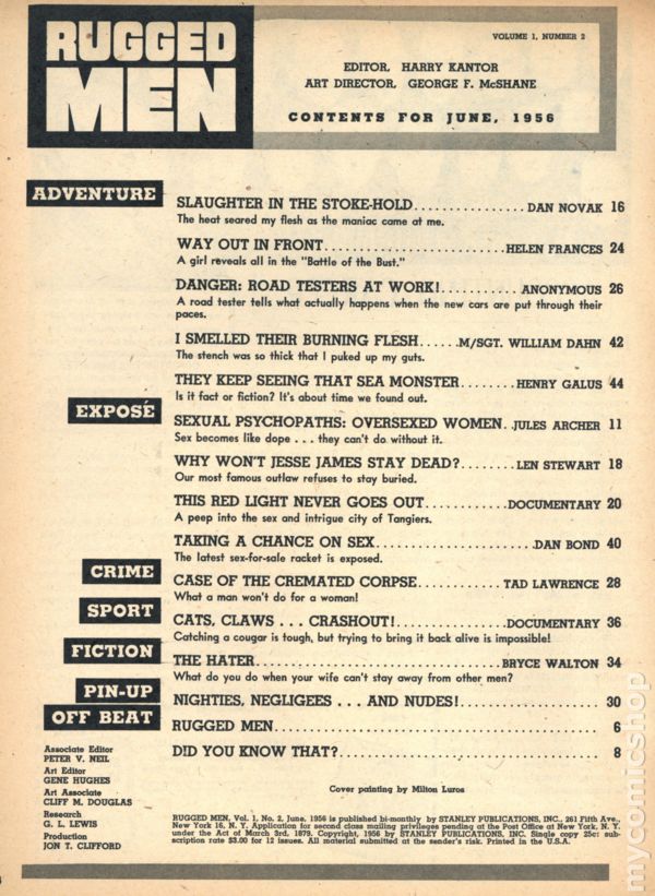 Volume 1, Issue 2 - June 1956. Men's interest magazine focusing on war and crime stories, along with a monthly pin-up girl pictorial. Cover stories include "Sexual Psychopaths..Oversexed Women!" and "Why Won't Jesse James Stay Dead?" 8 1/2-in. x 11-in., 76 pages, Text (with B&w illustrations and photos throughout) Cover price $0.25.