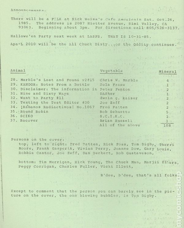 No. 1067 - October 24, 1985. APAzine (Amateur Press Association) by the Los Angeles Science Fiction Society. APA-L covers a very broad range of topics and is basically a lot of mini-fanzines by assorted LASFS members collated and bound together by the LASFS editor. 8 1/2-in. x 11-in., 108 pages, black and white.