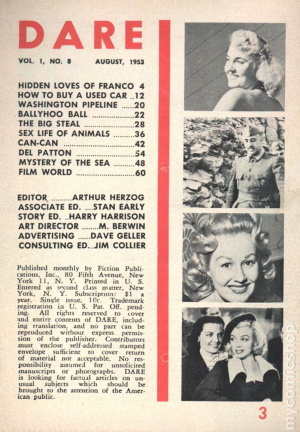 Canadian Edition - Volume 1, Issue 7 - August 1953. Men's interest magazine focusing on Military, Politics, celebrities and showgirls. 4-in. x 6-in., 68 pages, B&W Cover price $0.10.