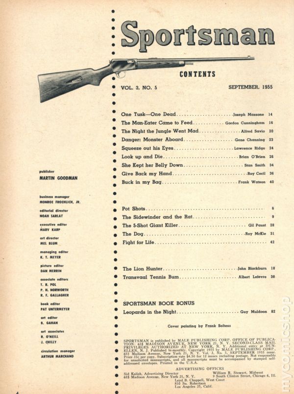 Volume 3, Issue 6 - November 1955. Men's interest magazine focused on tales of daring and hunter's prowess. Cover painting by Rudolph Belarski. 8 1/2-in. x 11-in., 98 pages, B&W. Cover price $0.35.
