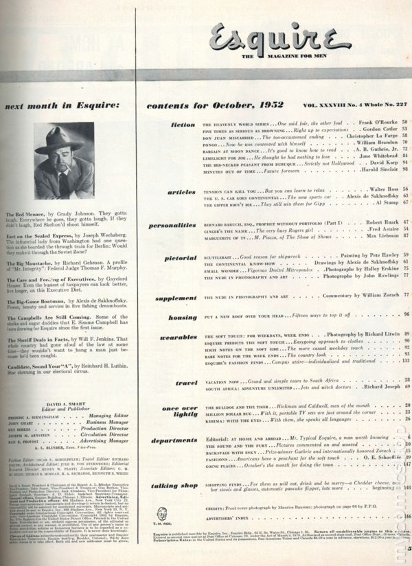 Esquire (1933 Esquire, Inc.) Magazine Vol. 38 #4Published Oct 1952 by Esquire Magazine.