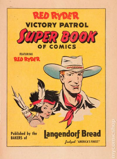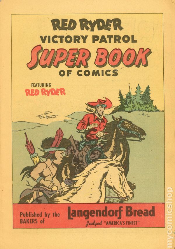 Langendorf Bread giveaway Red Ryder Victory Patrol Super Book of Comics. Comic only. Does not include cut-out "Rodeomatic" radio decoder, order coupon for "Magic V-Badge", cut-out membership card and certificate. Fred Harman's classic cowboy hero, along with his sidekick, Little Beaver, fought for justice in the wild west. This contains two comic stories in color and two Little Beaver text stories. Cover of comic is newsprint, 7 1/4-in. x 10 1/4-in., 32 pages, full color. Cover price $0.10.