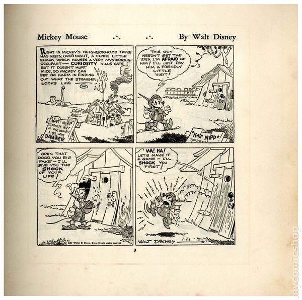 Story by Floyd Gottfredson. Art by Earl Duvall and Floyd Gottfredson. One of the earliest Mickey Mouse comics, from pioneering comics publisher David McKay. Collects comic strips from Jan. 19 - Feb. 25, 1931 and Nov. 16 - Dec. 5, 1931. Mickey and his rival Kat Nipp get into a contest to tie knots in each other's tails. (This volume contains the only known reprint of the infamous strip of 2/4/31, where Kat Nipp actually snips off the end of Mickey's tail with a pair of scissors!) Also, Mickey works as volunteer fireman. Mickey Mouse vs Kat Nipp; Fireman Mickey; Clarabelle's Boarding House. Final issue of the series. 10-in. x 10-in., 48 pages, B&W.