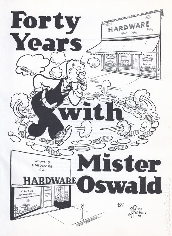 Forty Years With Mr. Oswald, published in 1968, and written and illustrated by Russell "Russ" Johnson, chronicles wonderfully via a comic strip format one man's lifetime in the hardware business. Russ Johnson started drawing strips about daily life and trials of a hardware store owner around 1927 when he went to work in his fathers hardware store. Soon, the Hardware Retailer, a magazine geared towards hardware store owners and suppliers, found out about these strips and asked Johnson to begin submitting strips for each months issue. Johnson continued drawing Mister Oswald for the next 65 years. Johnson adds a nice anecdotal summary before each chapter. The attention to detail is impressive given how busy Johnson was as he was almost always working. The first few pages of the book look almost nothing like the rest because Johnsons style and sophistication as a comic artist and story teller grew at a very rapid rate. Johnsons characters are filled with life through masterful story telling, realistic settings, brilliant situations, and hilarious dialog. The writer who contributed to this review concludes, "Each page has me wishing I worked with these people and I cant stop wondering what it might have been like to know and work with the real Mr. Oswald." Black and white art, 286 pages, hardback.